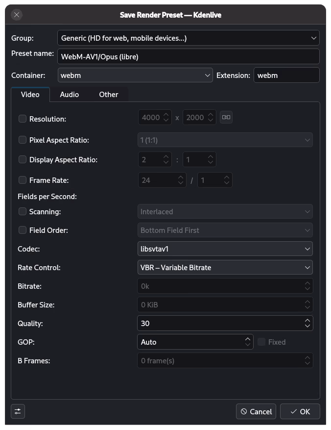 I made a new preset. Added it to the Generic group and named it ‘WebM-AV1/Opus (libre)’ to match the layout of the other presets. Set the container to webm.